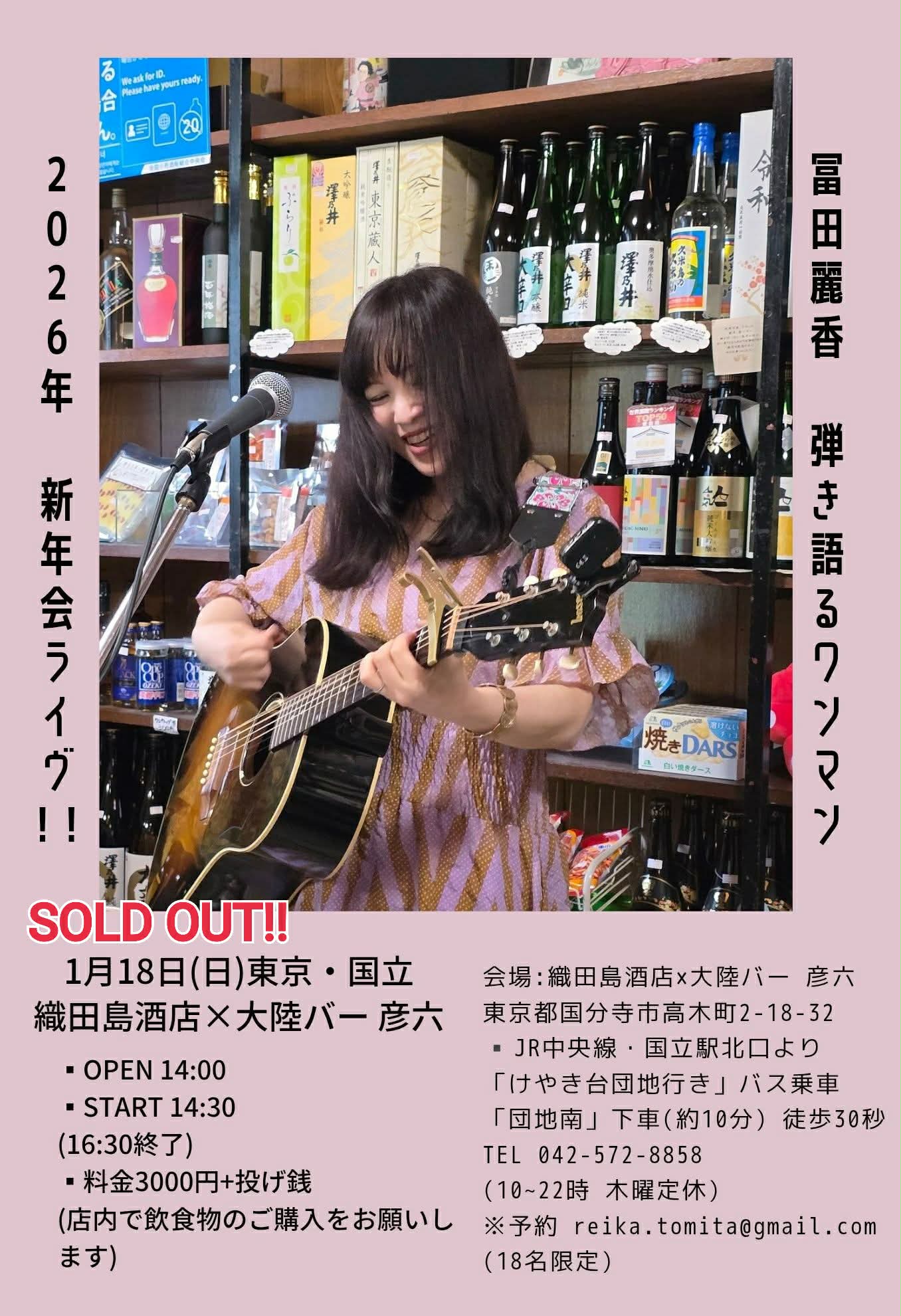 1月18日(日)国立・織田島酒店×大陸バー彦六 『冨田麗香・弾き語るワンマンVol.84 〜新年会ライヴ 2026〜』