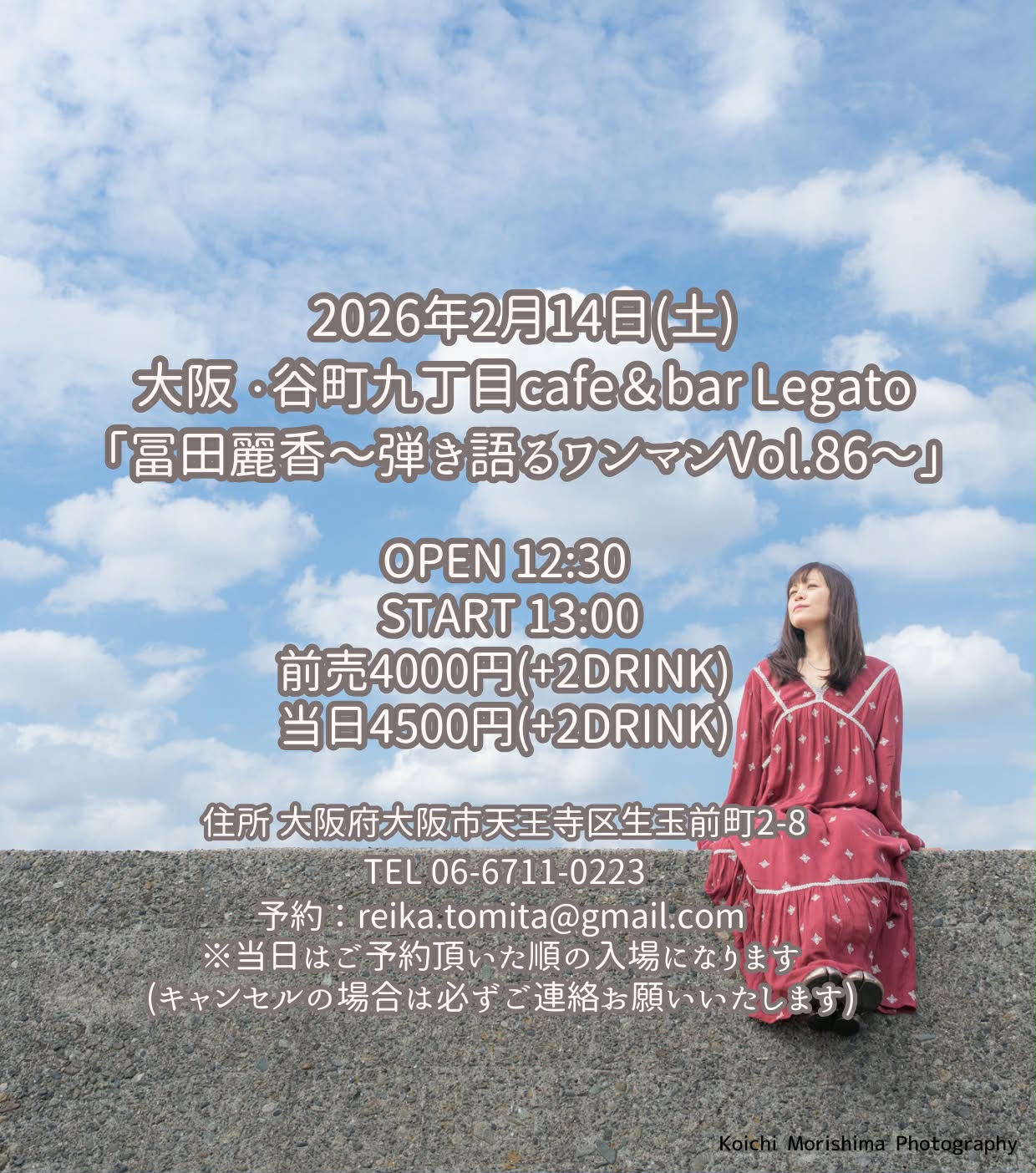4月26日(日)大阪・谷町九丁目cafe&bar Legato 『冨田麗香・弾き語るワンマンVol.89 〜SPRING TOUR 2026〜』