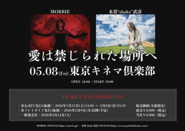 出演:MORRIE × 木暮"shake"武彦*木暮"shake"武彦+柏原克己(Dr.)、柏原ヒカル(B)、冨田麗香(Cho.) 会場:東京キネマ倶楽部 時間:OPEN 18:00 / START 19:00 料金:前売8,000円(+1DRINK別) / 当日9,000円(+1DRINK別) 全席指定 先行販売:1月31日(土)12:00〜2月8日(日)23:59 COSMIC MATE第一先行予約 https://www.psychodelicious.com/contents/343913 一般発売:2月14日(土)10:00〜 ローソンチケット e+(イープラス) お問合せ:ディスクガレージ https://info.diskgarage.com/ 東京都台東区根岸1-1-14(東京キネマ倶楽部) |